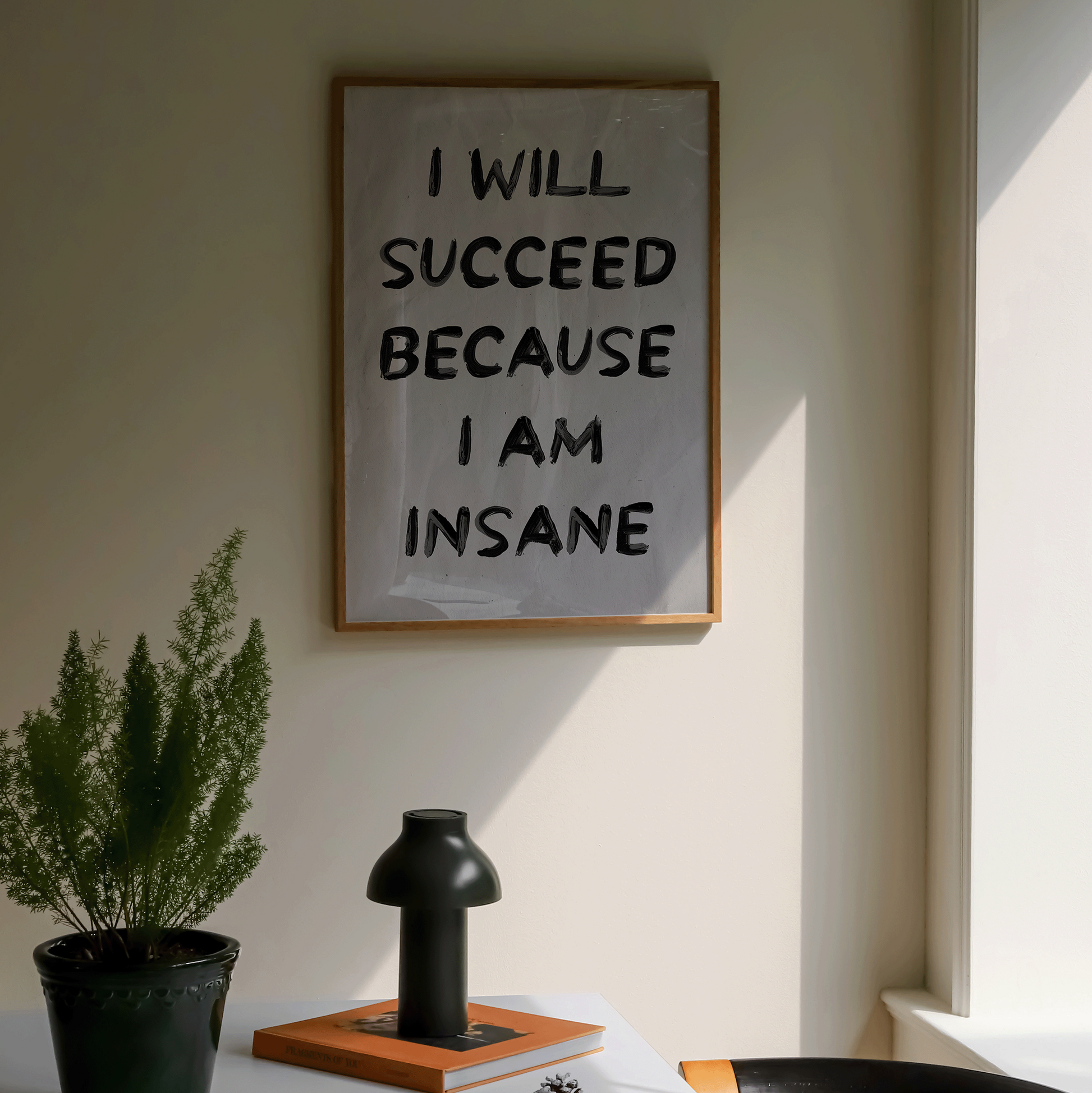 The I Will Succeed Because I Am Insane motivational print is bold typography wall art created for ambitious, driven minds. Featuring expressive hand-painted lettering, this inspirational quote print brings focus and motivation to home office wall decor, bedrooms and creative workspaces.