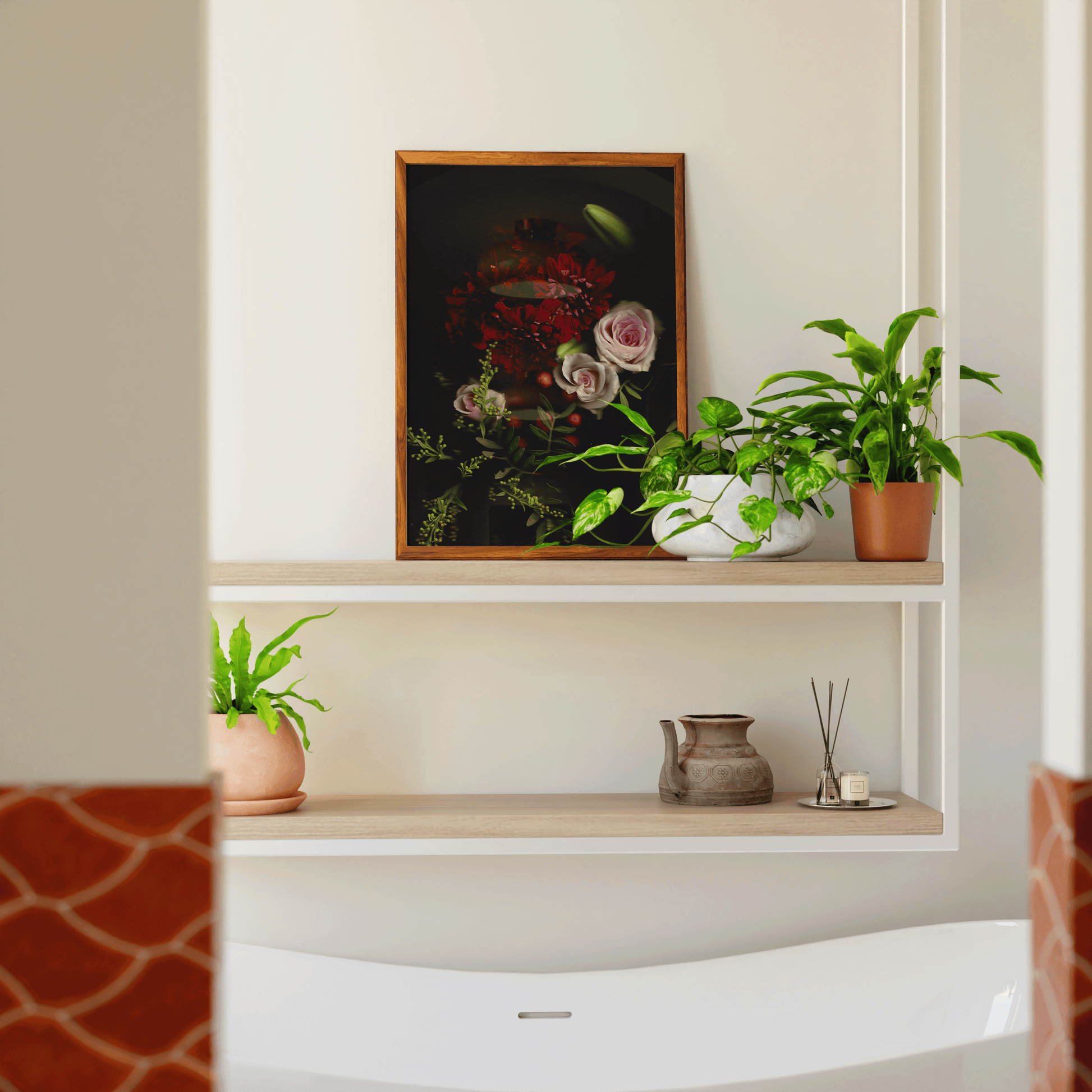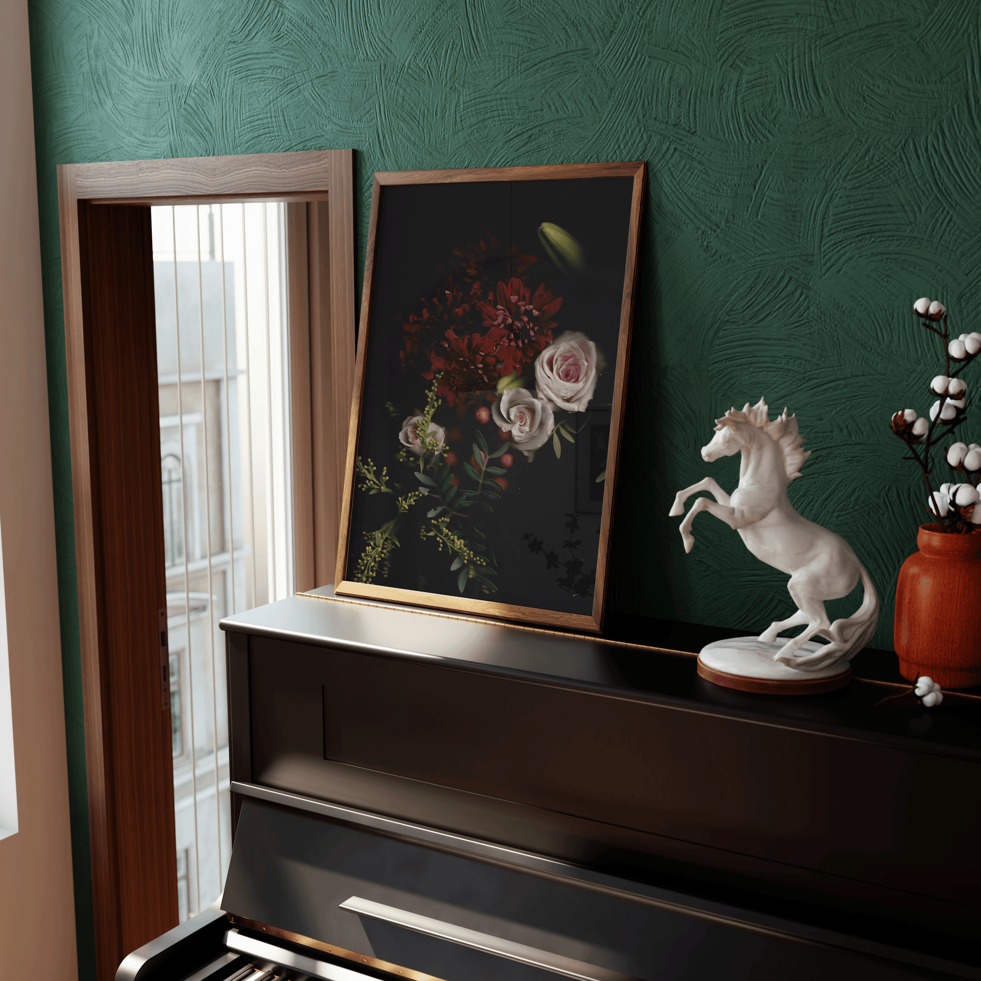 This moody floral wall art features real flowers that have been carefully scanned, preserving their natural texture, rich tones, and delicate imperfections. Deep red blooms and soft blush roses sit against a dramatic dark background, creating elegant dark botanical wall decor with a romantic, vintage-inspired feel.