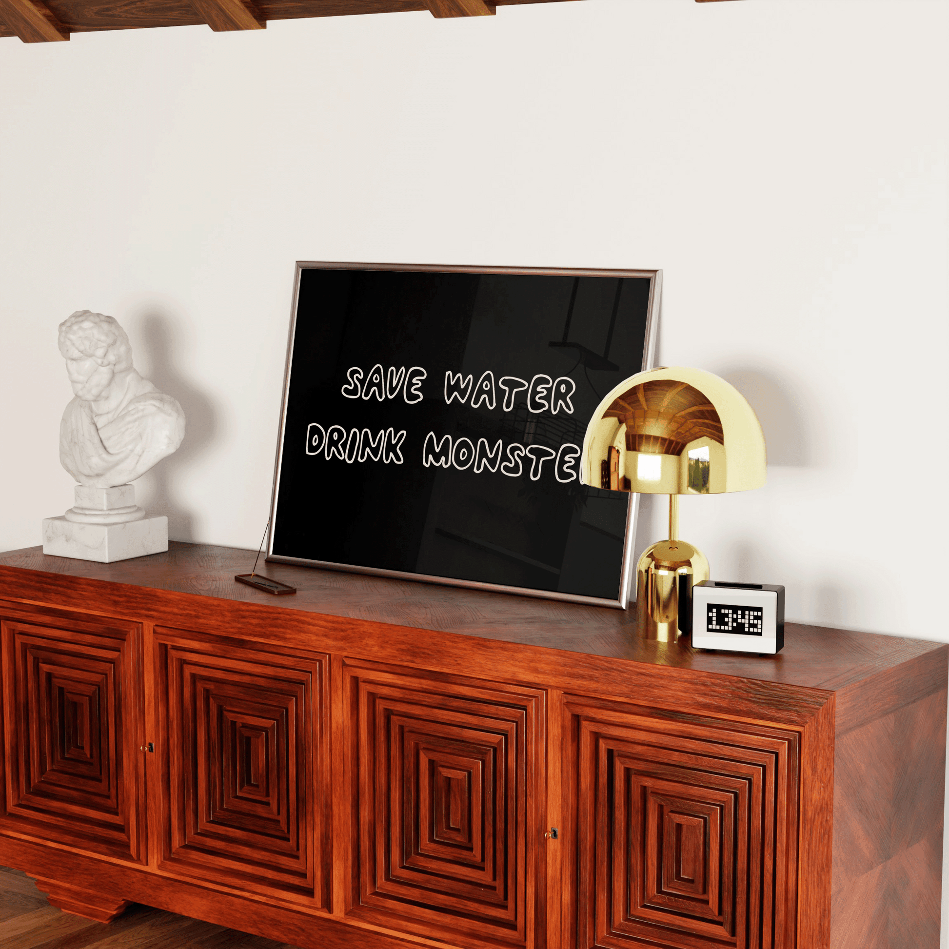 A bold, minimalist “Save Water Drink Monster” wall art print designed for modern interiors. This clean typography poster is ideal for kitchens, home bars, gaming rooms and gym spaces, making it a strong choice for anyone searching for Monster Energy wall art or funny energy drink wall decor.